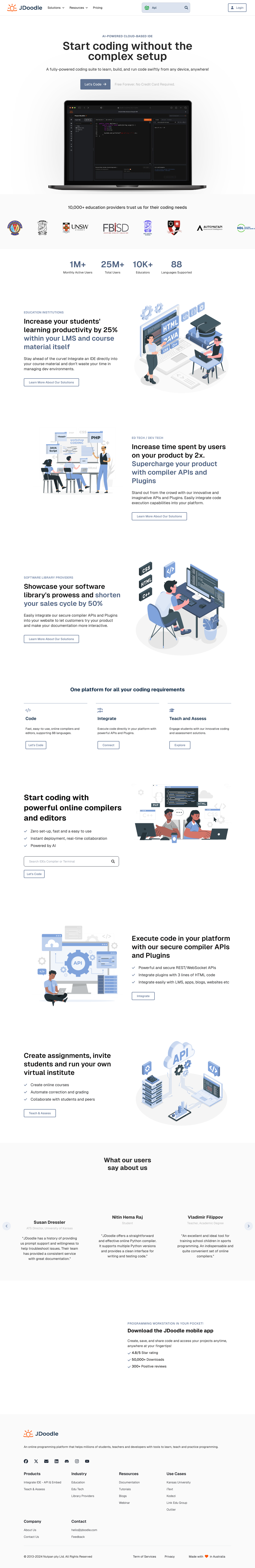 • 教师:使用JDoodle可以节省自己和学生的时间,避免调试开发环境问题,并可使用我们的免费评估和课程平台进行在线评估。