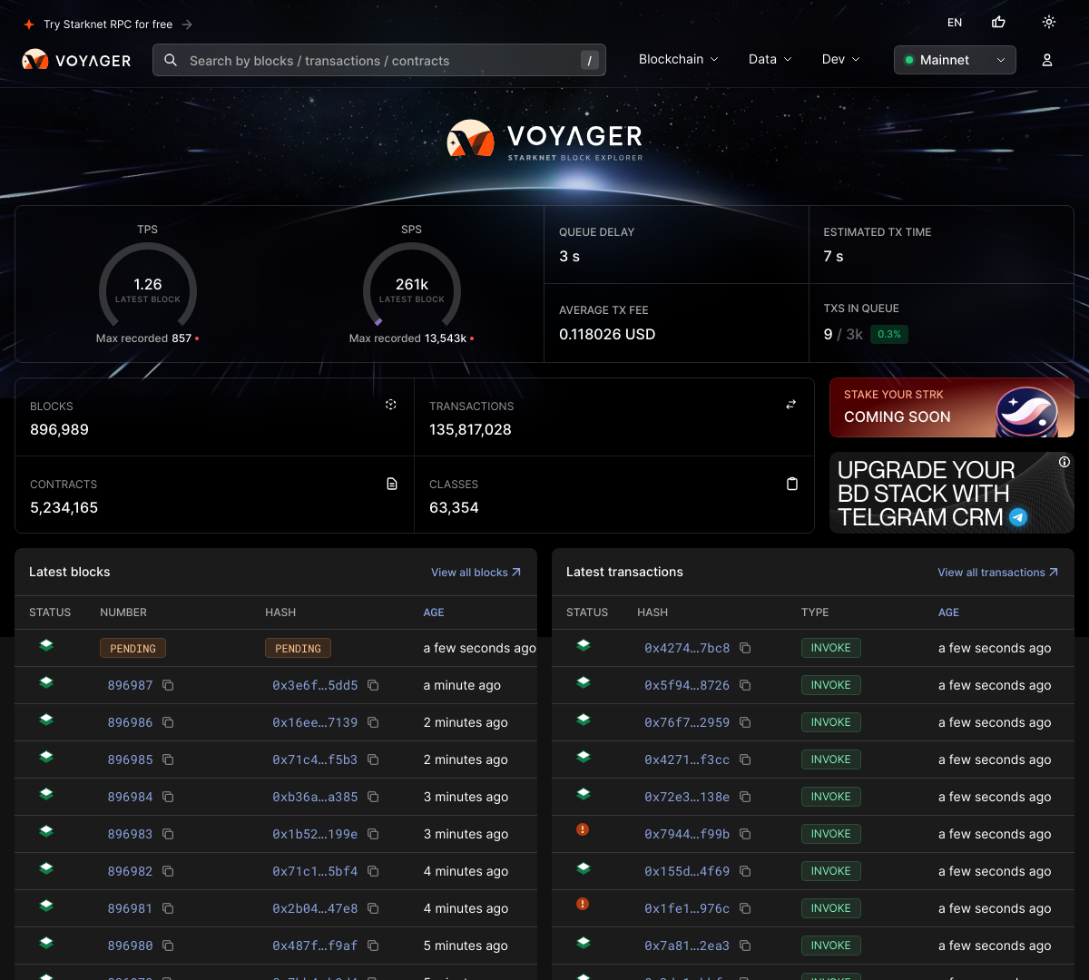 更多Voyager 是一个 Starknet 区块链浏览器,提供 Starknet RPC 服务、数据查询和开发者资源。它支持主网操作,并通过社交媒体平台与社区互动。Voyager 提供了包括 Juno Starknet 客户端、Cairo 语言书籍和 Starknet 示例教程在内的多种开发者工具,旨在促进 Starknet 生态系统的开发和使用。