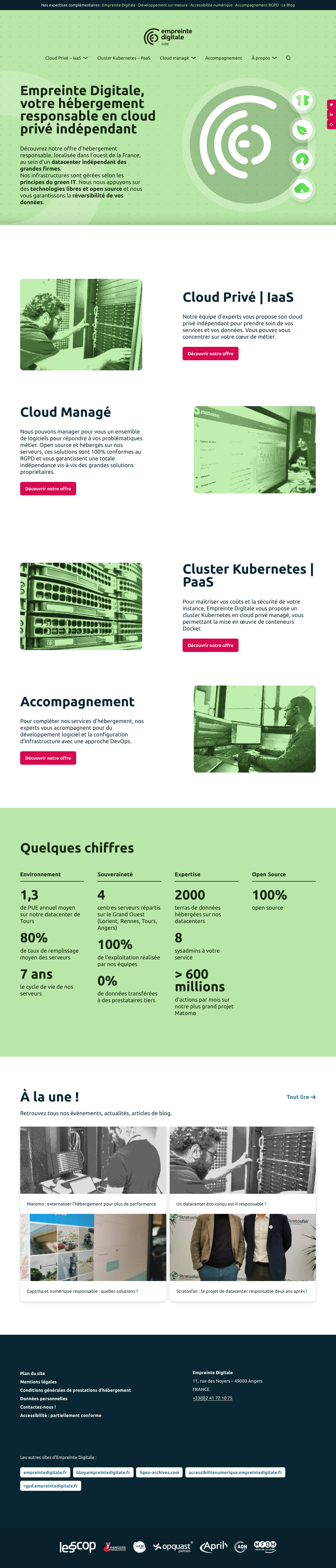 更多Empreinte Digitale是一家提供独立私有云服务的法国公司,专注于绿色IT原则,使用自由开源技术,并保证数据可逆性。公司位于法国西部,提供云私有IaaS、Kubernetes PaaS和云管理服务,同时提供软件开发和基础设施配置的DevOps方法支持。