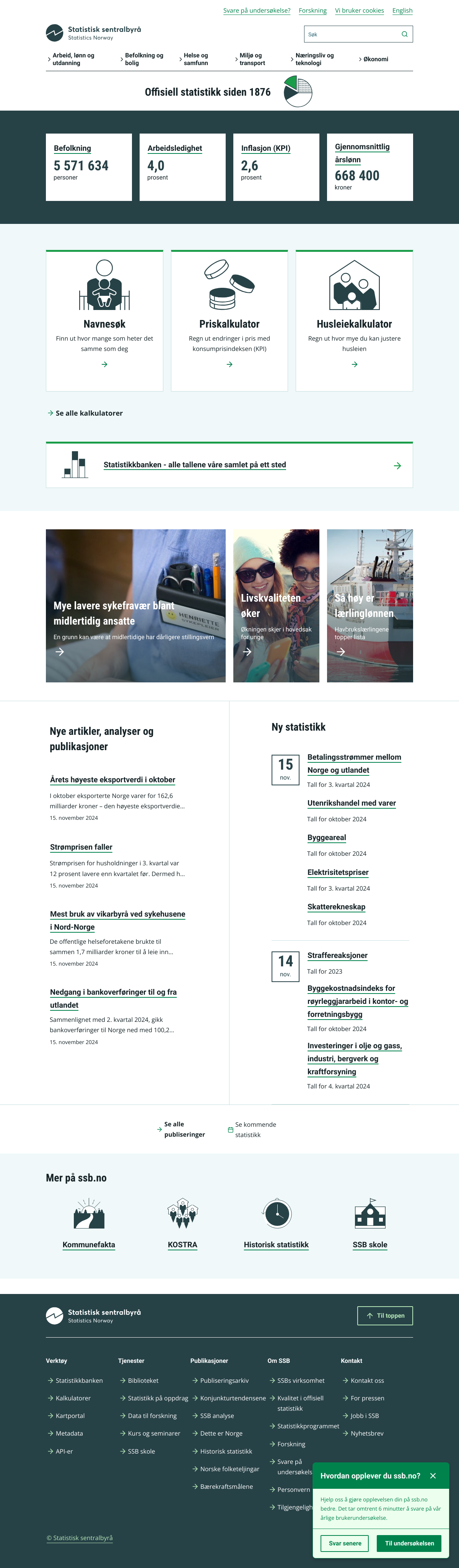 更多Statistisk sentralbyrå(挪威统计局)是挪威官方的统计机构,自1876年以来负责收集和发布国家统计数据。主要业务包括劳动力、收入和教育、人口和住房、健康和社会、环境和交通、商业和技术、经济等领域的统计。提供数据查询、统计计算器、统计数据库等多种服务。
