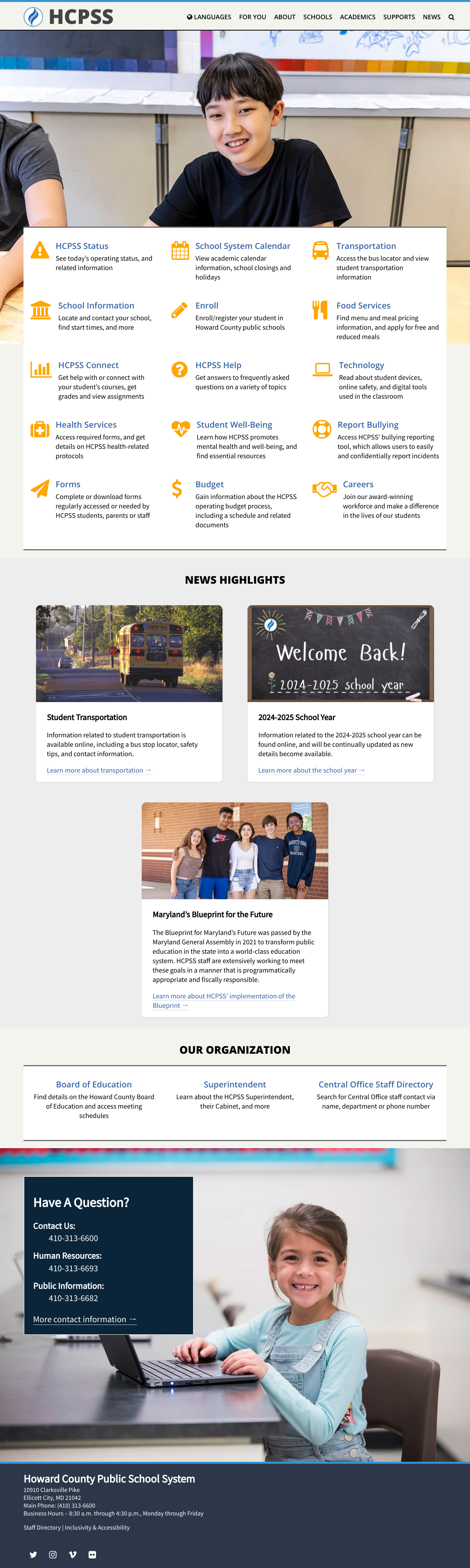 更多HCPSS(霍华德县公立学校系统)是一个服务于霍华德县的公立学校系统,提供从幼儿园到高中的教育服务。它包括学校信息、学生注册、食品服务、技术支持、健康服务等多个业务板块,致力于提升学生的学业成绩和身心健康,同时推动教育预算和政策的实施。
