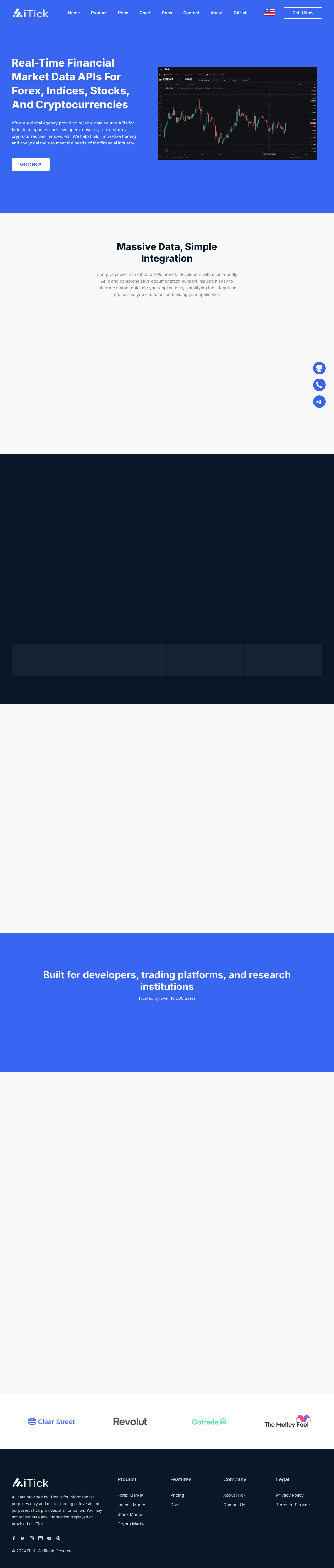 iTick提供的实时金融市场数据API,覆盖外汇、指数、股票和加密货币等金融产品,旨在为金融科技公司和开发者提供可靠的数据源,帮助构建创新的交易和分析工具,满足金融行业需求。