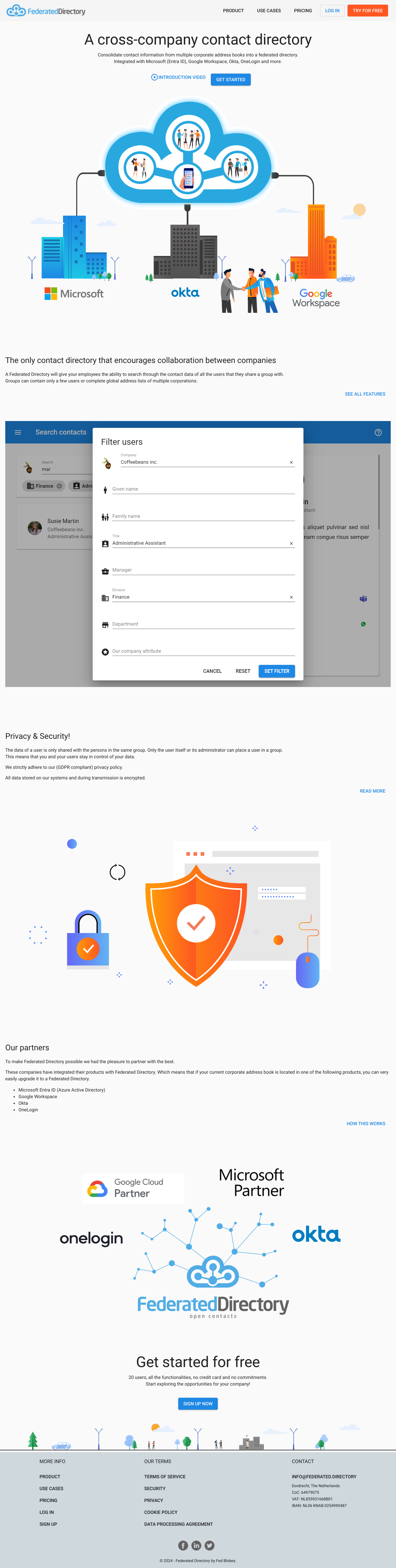 更多Federated Directory是一个跨公司的联系人目录,集成了微软、谷歌、Okta、OneLogin等多个企业地址簿,允许员工搜索共享群组的联系人数据,强调隐私和安全,数据加密传输,符合GDPR合规性。