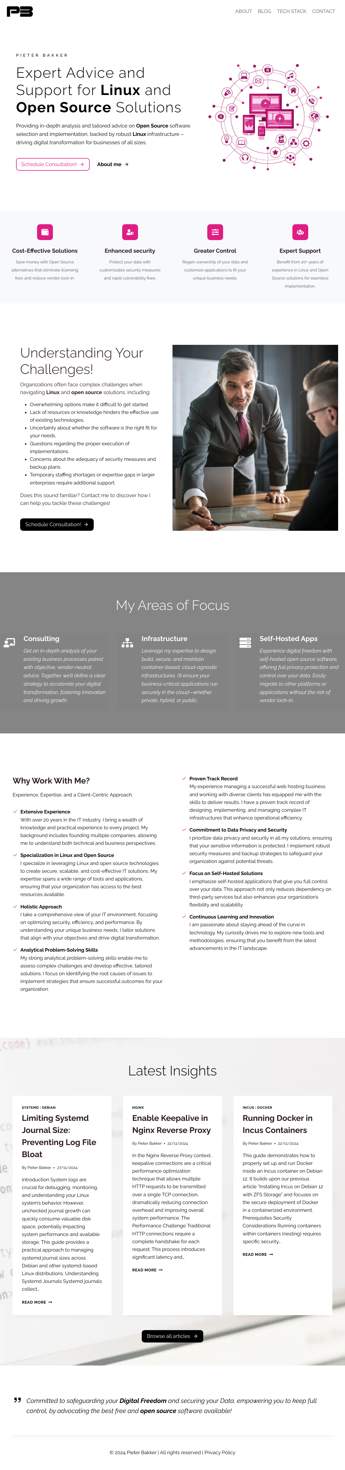 更多Pieter Bakker 提供专业的 Linux 和开源解决方案咨询服务,包括深入分析、定制化建议、基础设施建设和自托管应用。他凭借20多年的行业经验,专注于通过开源技术为客户提供安全、可扩展且成本效益高的IT解决方案,帮助企业数字化转型。