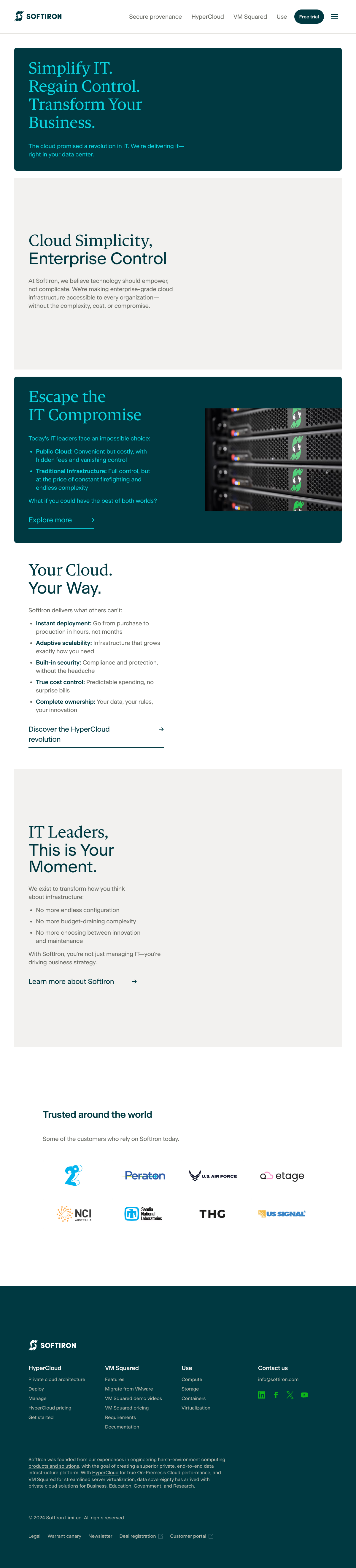 更多SoftIron是一家提供企业级云基础设施的公司,致力于简化IT、重获控制并转型业务。公司主营产品包括HyperCloud和VM Squared,分别提供真正的本地云性能和简化的服务器虚拟化解决方案,帮助企业实现数据主权,服务于商业、教育、政府和研究领域。