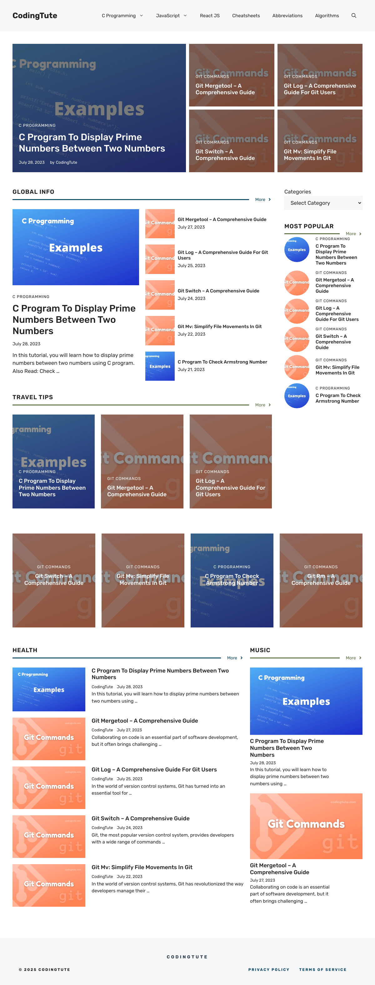 更多CodingTute是一个专注于编程教育的网站,提供C语言编程、JavaScript、React JS等编程语言的教程和示例。同时,网站还涵盖了Git命令指南、算法以及编程相关的缩写词,旨在帮助开发者提升技能和解决编程问题。